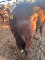 R QH 3 YR BROWN STUD GROUND TRAINED BROKE TO RIDE - FULL RIG SADDLE (WESTERN) SNAFFLE BIT COLT IS NOT RANK BUT CAN BE A PUNK (HE'S YOUNG) COLT HAS 'BUBBLE' ON LEFT STIFLE. DOES NOT PRESENT LAME BUT SEEMS TO FAVOR THAT SIDE. CAN BE RIDDEN AND USED BUT NOT CONFIDENT THAT HE WOULD HOLD UP WITH STRENUOUS WORKS. IMPECCABLE RACING BLOOD AND WOULD PRODUCE AWESOME FOULS ON RANCH BRED MARES! HORSE SALE FEB 21, 2026 SADDLES START @ 6PM | 178 | $ 2,000.00 |