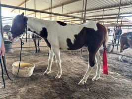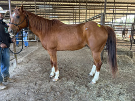 R PT 2 YR RED/WH MARE Here is a royally bred 2 year old colt that stands 15 hands and is built correct in every way. This colt has had a hand full of rides and exceeds expectations every day. This nice colt has a reigning back ground on top as well as a phenomenal cow horse breeding on bottom. This colt will excel in the show pen or make a super nice rope horse. Here is an opportunity that does not come round often. Sells sound and gentle with absolutely no issues. MARCH 14 2026 SADDLES START AT 6 PM | 510R | $ 2,100.00 |