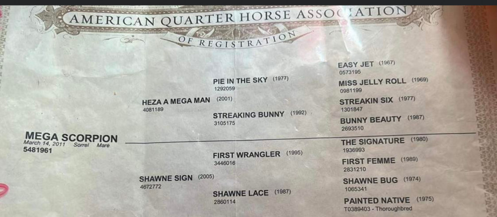 **note from owner- the papers were accidentally ripped, but we have called American quarter horse association, and they said that ripped papers is not an issue as long as we provide her number which we have.!***