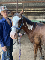 "Great trail mare. Very sweet rescued 3 months ago. She’s a very sweet gentle mare. She does need a tune up because she doesn’t know a ton. But follows great on trails. Very in your pocket no kick, bite, loads and unloads great. Was getting her fat selling because of divorce. Needs tlc loves attention. Absolute baby. She can see out of feathered eye. Does not bother her. Low man on totem pole. Not spooky! Picks up feet great."