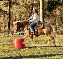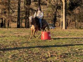 MARY LOU IS A 8 YR OLD MARE. SHE IS ABOUT 12.3HHS. THIS LITTLE MARE IS SUPER BROKE BROKE BROKE. SHE DOES HAVE LOTS OF GO AND BUTTON SO KID DOES NEED TO KNOW HOW TO RIDE. SHE HAS BEEN ROPED OFF OF AND PLAY WITH AROUND THE BARRELS WITH. SHE IS JUST HANDY BROKE THAT PICKS UP STUFF VERY EASY. SHE DOES NEED A STOUTER BIT AS SHE IS A LITTLE HARD TO STOP BUT WITH A LITTLE WORK AND TIME THAT IS AN EASY FIX. SHE IS BLIND IN ONE EYE BUT IT DOES NOT EFFECT HER AT ALL