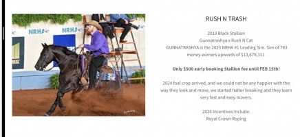 **SIRE:** Rush N Trash (2019 black stallion) by Gunnatrashya (LTE $233,757, 2023 NRHA #1 Leading Sire!) - NRHA Futurity Open Champion, NRHA Derby Open Champion, Congress Reining Futurity Open Champion! Sire of 783 money-earners with upwards of $13,679,311! Rush N Trash's 2024 foal crop has arrived and they learn very fast and are easy movers! π°π₯