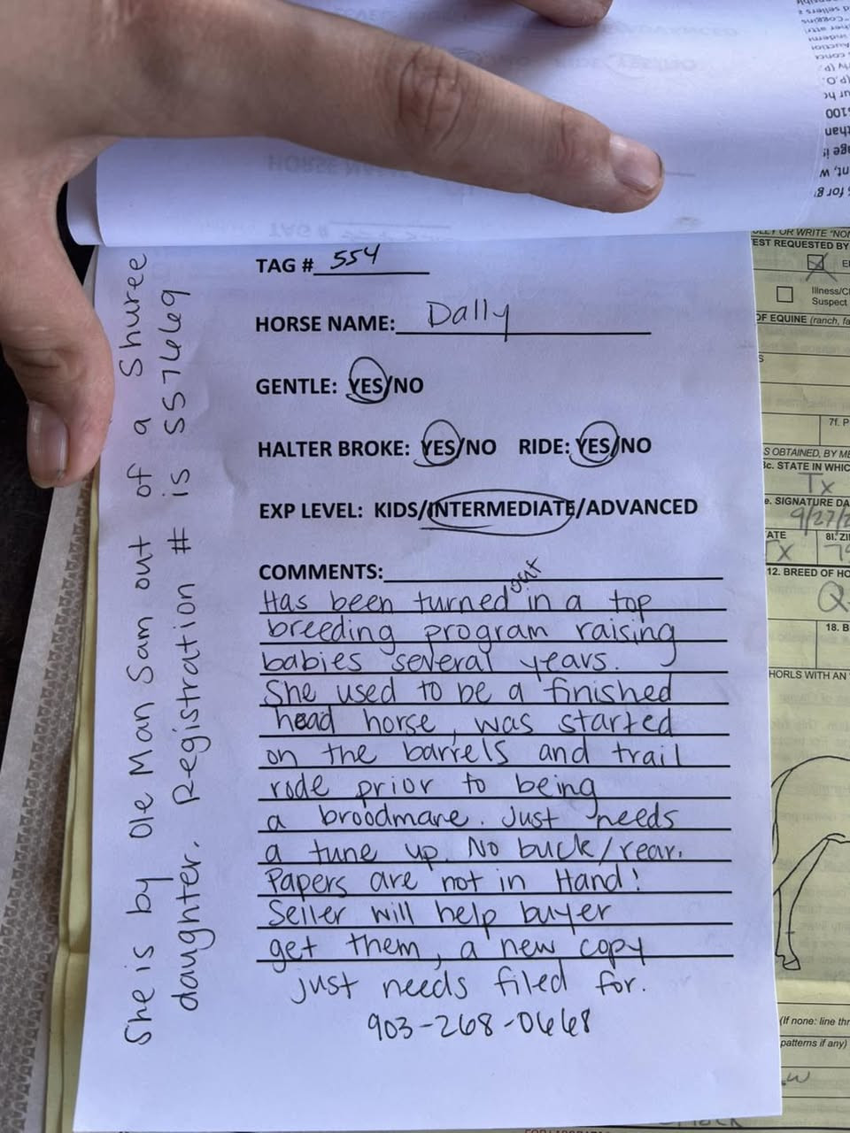 HAS BEEN TURNED OUT IN A TOP BREEDING PROGRAM RAISING BABIES FOR SERVAL YEARS. SHE WAS USED TO BE A FINISHED HEAD HORSE, WAS STARTED ON THE BARREL AND TRAIL RODE PRIOR TO BEING A BROODMARE. JUST NEEDS A TUNE UP. NO BUCK/REAR. PAPERS ARE NOT IN HAND BUT WILL HELP NEW BUYER GET A NEW COPY JUST NEEDS TO BE FILED. PLEASE GET WITH ME FOR THAT INFO. 903-268-0668