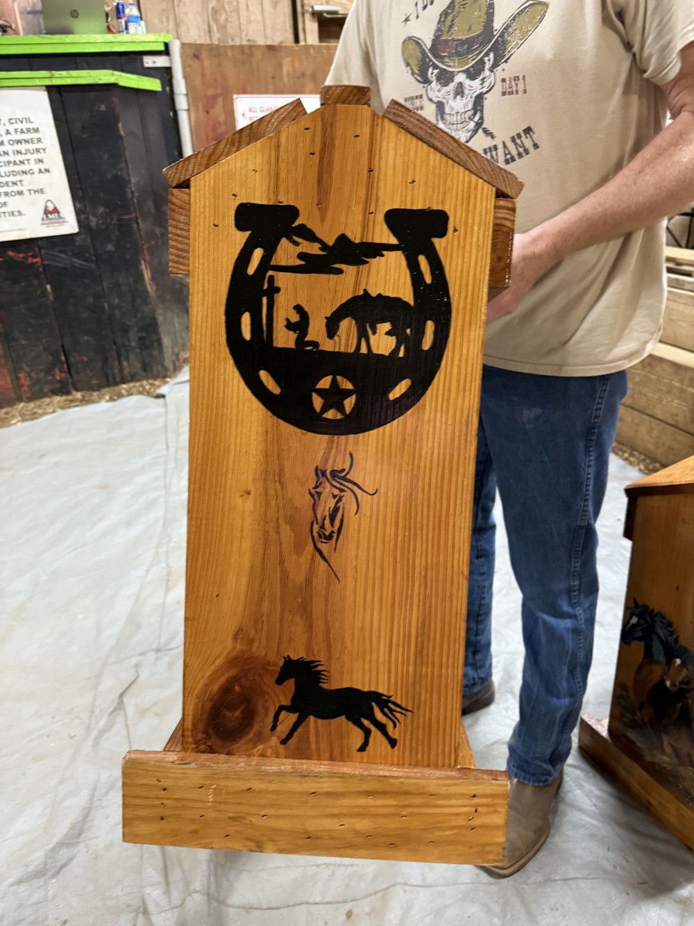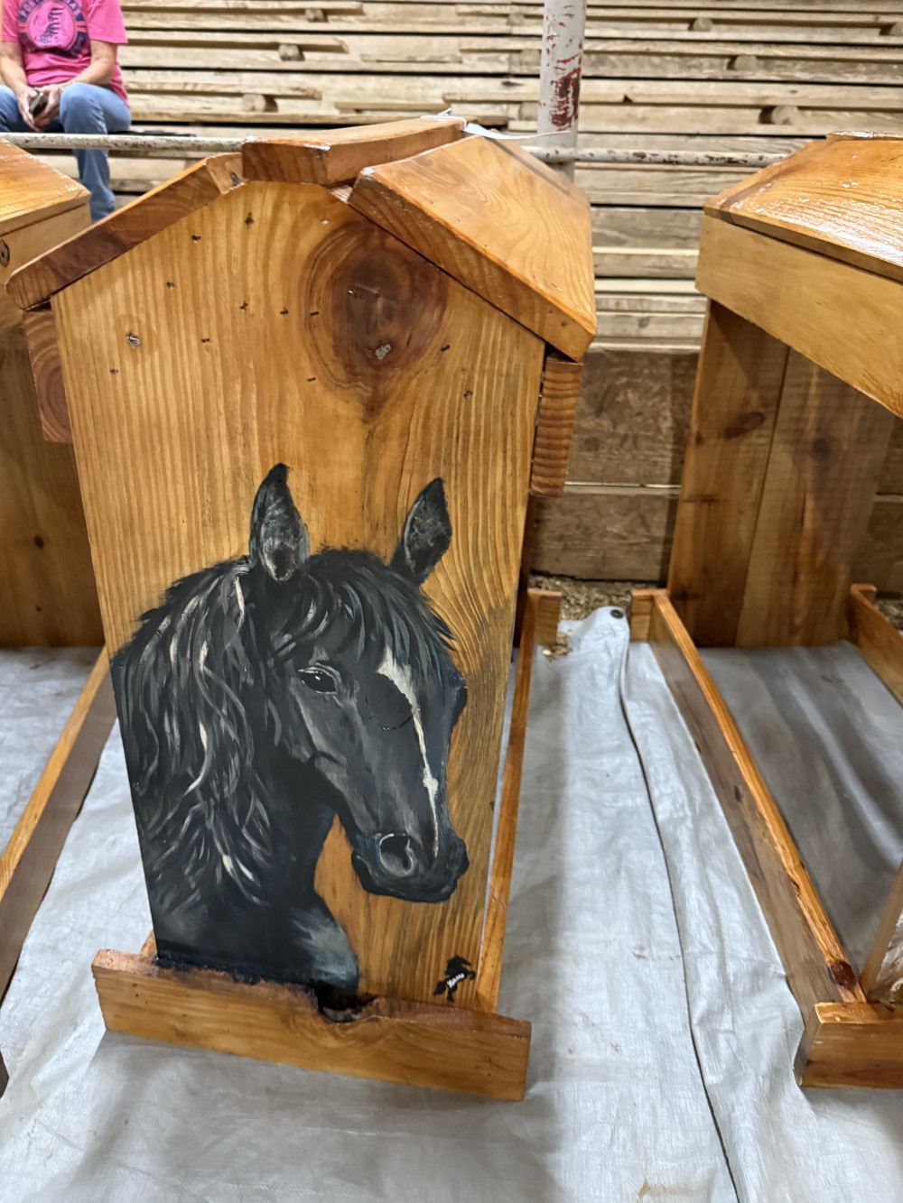 HAND PAINTED WOOD SADDLE RACK. BLACK (#S-33) NOV 8 TH HORSE SALE 2025 SADDLES START @6PM