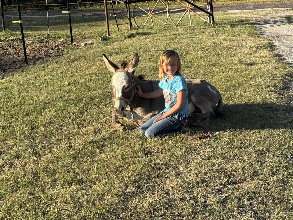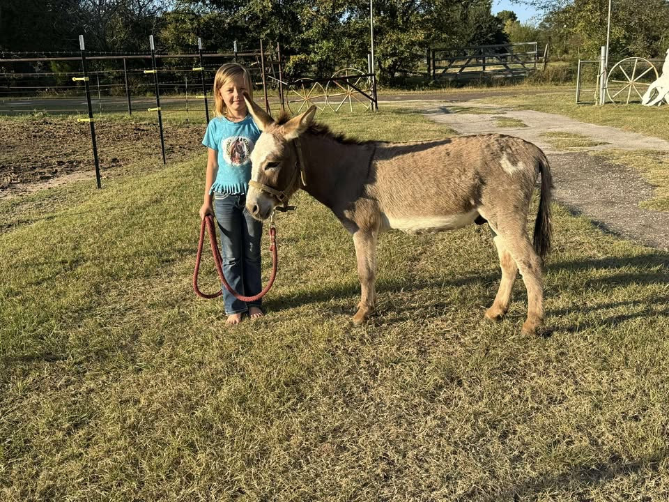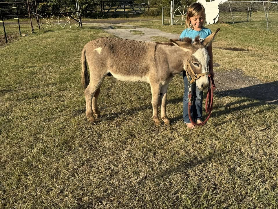 Jack is a 5 year old 31 inch tall miniature paint jack. He is super gentle and super sweet. He is easy to catch and handle. Jack is halterbroke, he leads, he loads, and he ties, and he stands for the farrier. Jack is also trained to lay down. He has been around goats, kids, and other horses, donkeys, and cows. I bought him last spring to breed my pony mares and he did just that. So if you’re looking for a sweet donkey to add to your pasture he’s it. He will breed mares, and Jenny’s.