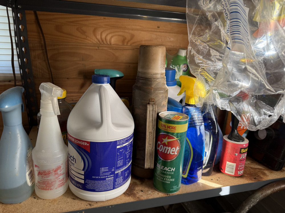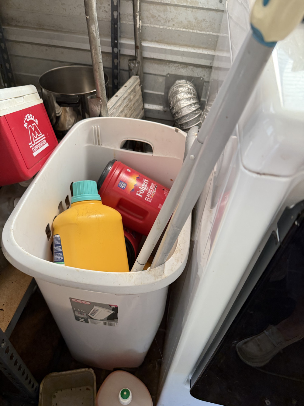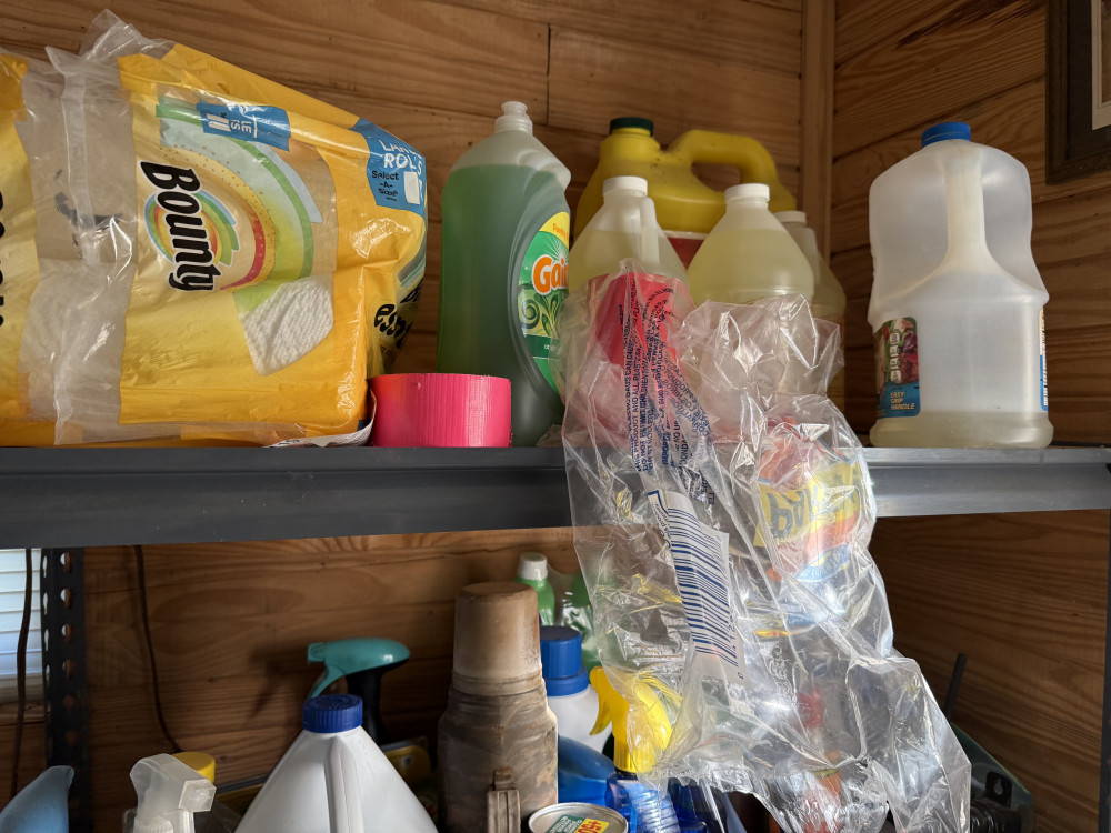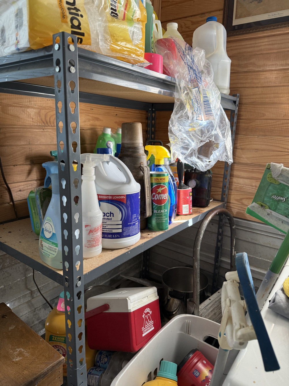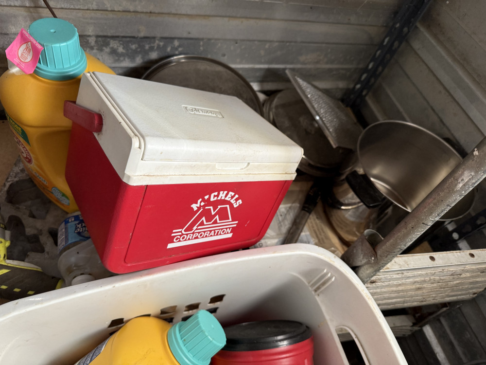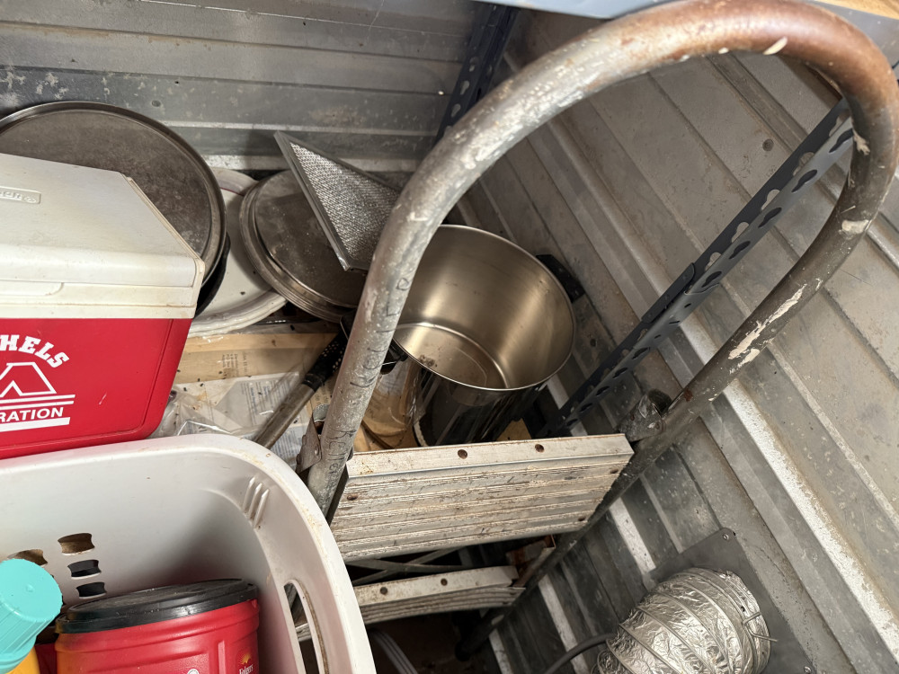 SHELF W LAURY BASKET AND STEP LATTER WITH JUGS (#351) ESTATE SALE