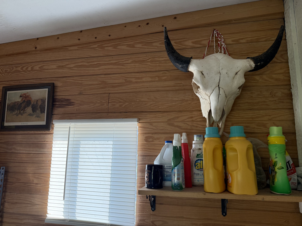 SHELF ABOVE WASHER W detergent,, SIGN, AND SKULL (#353) ESTATE SALE