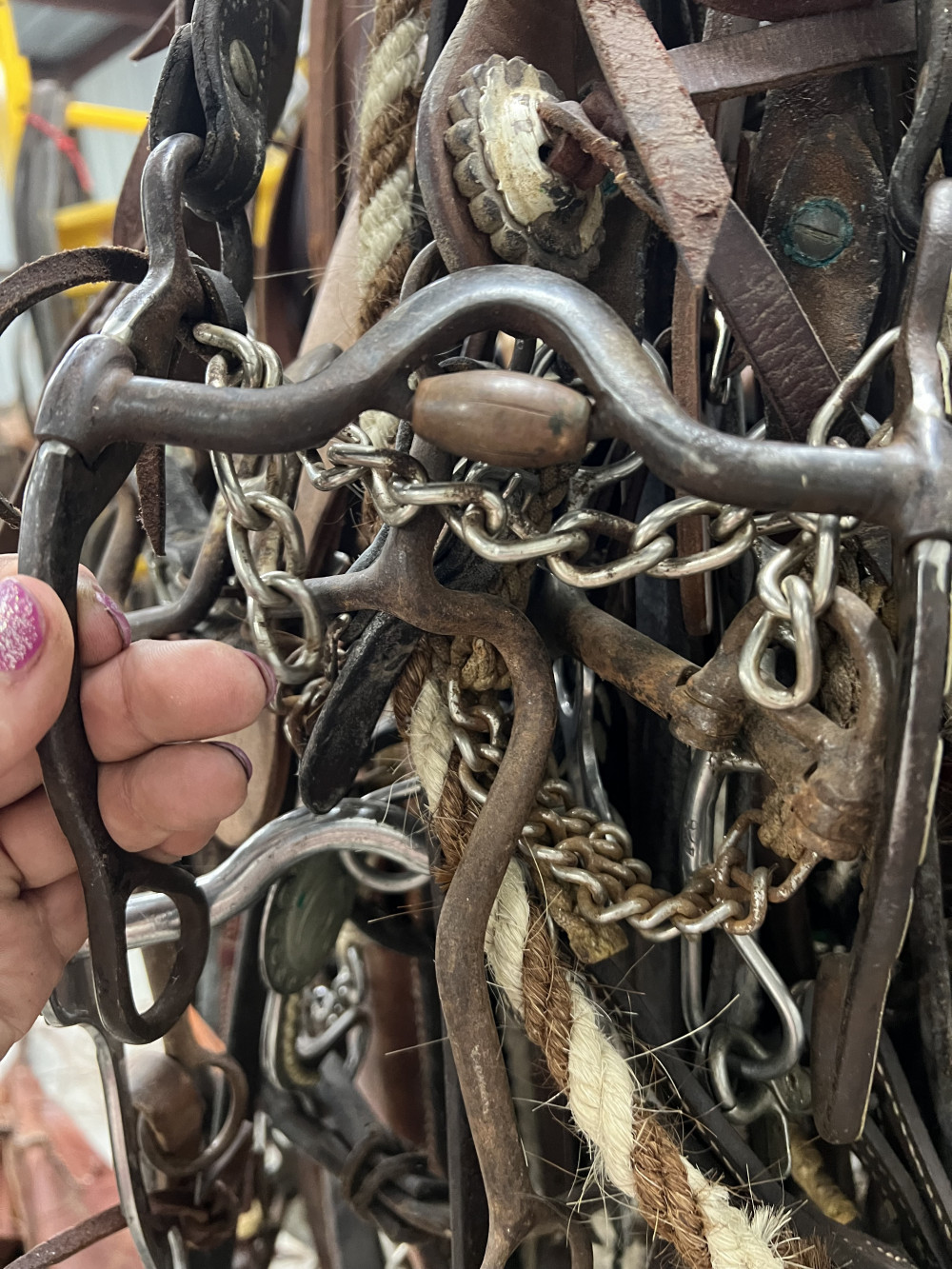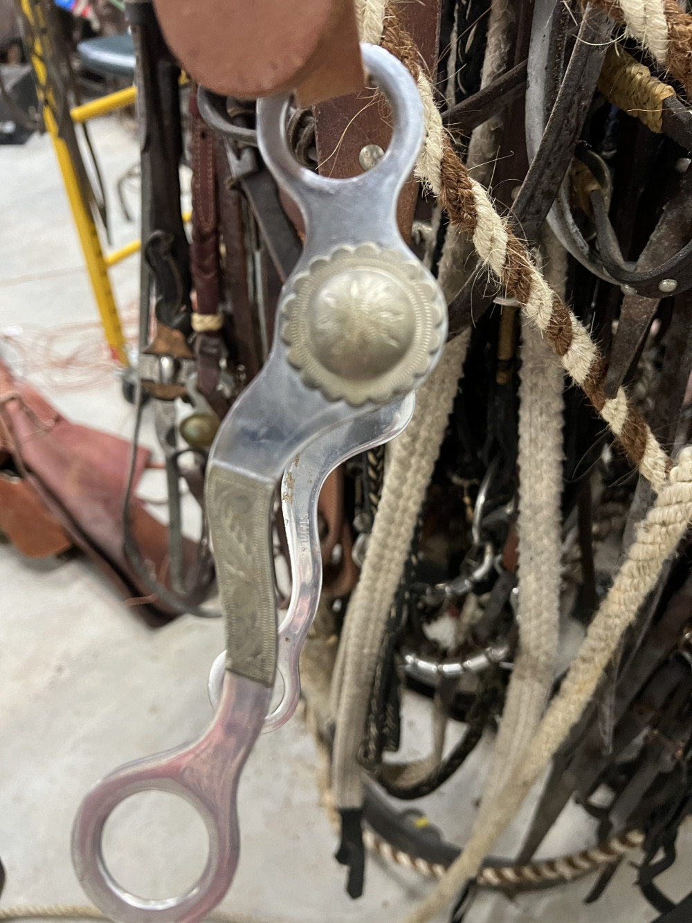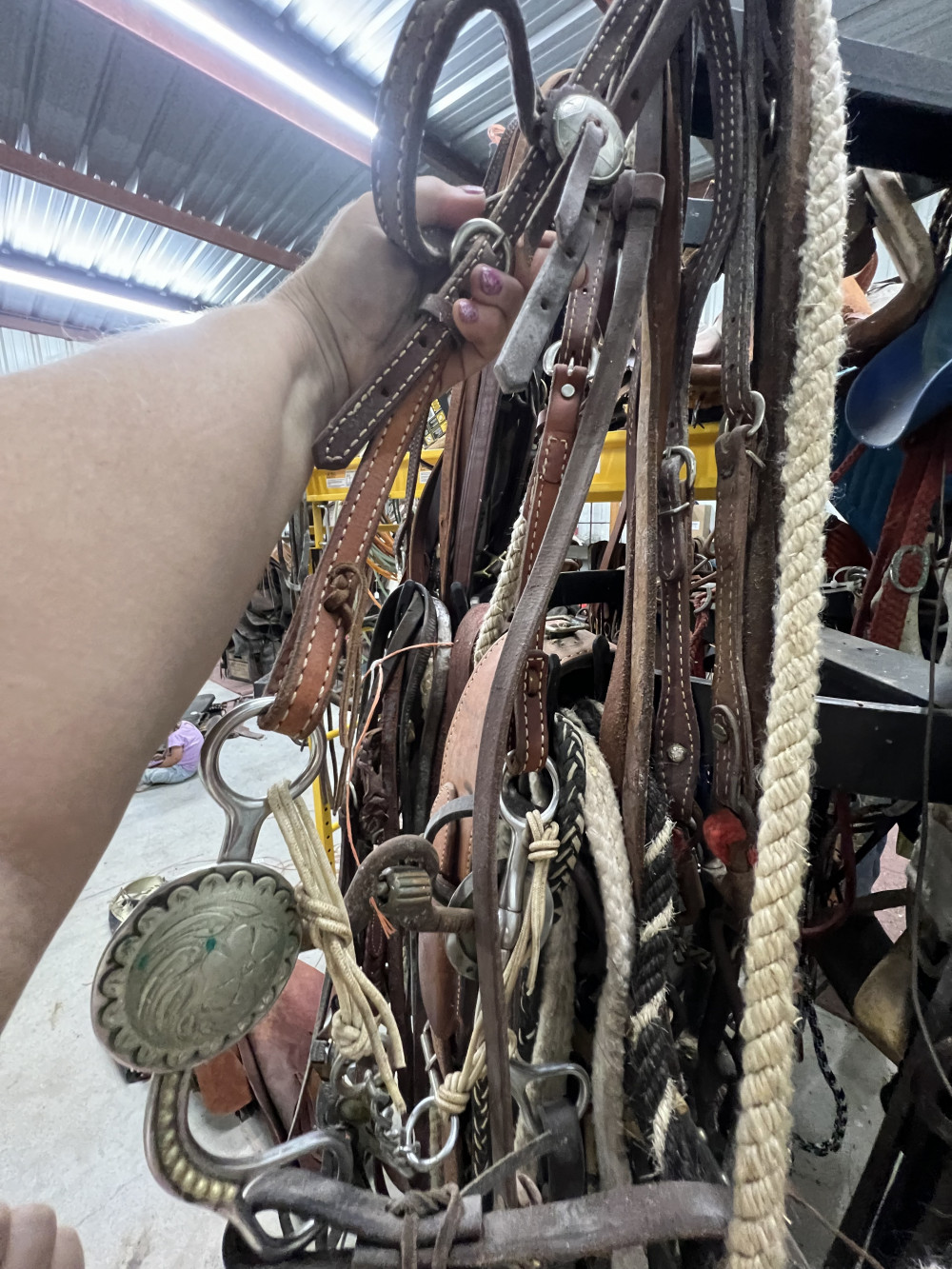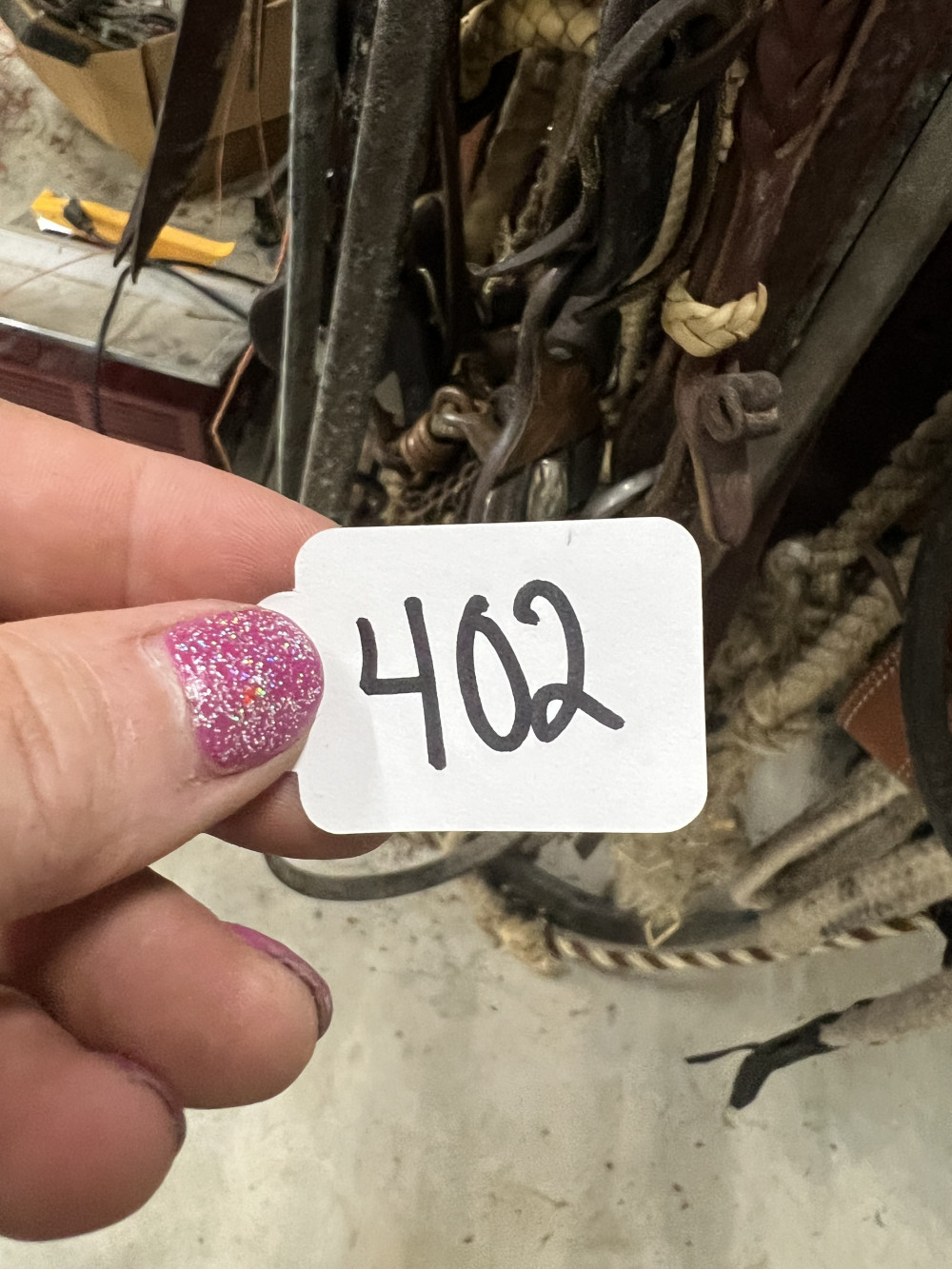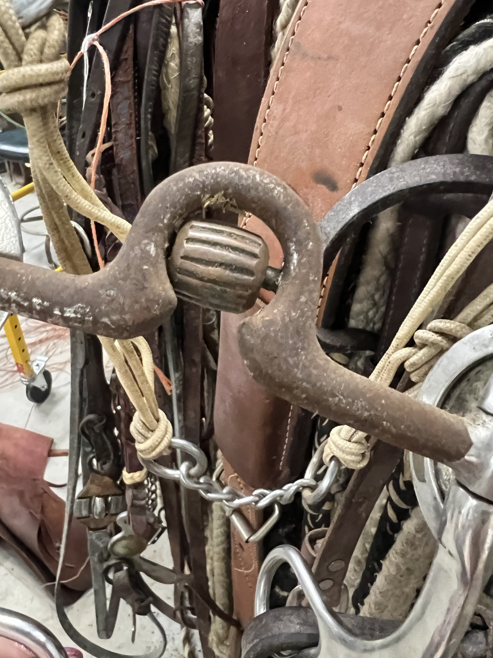 4 COMPLETE HEADSTALLS, 2 BRIDLES, AND CHOKE ROPE (#402) ESTATE SALE