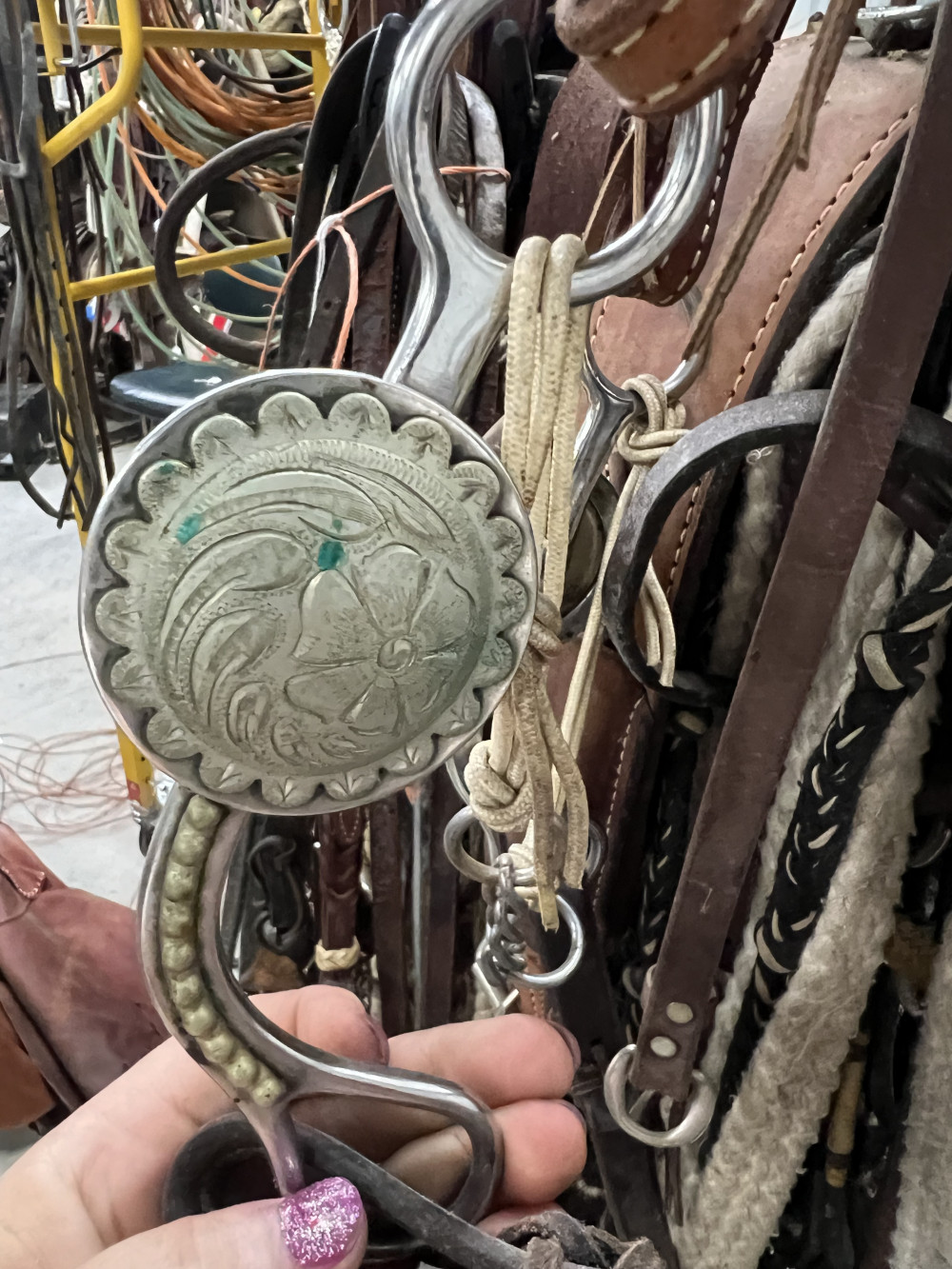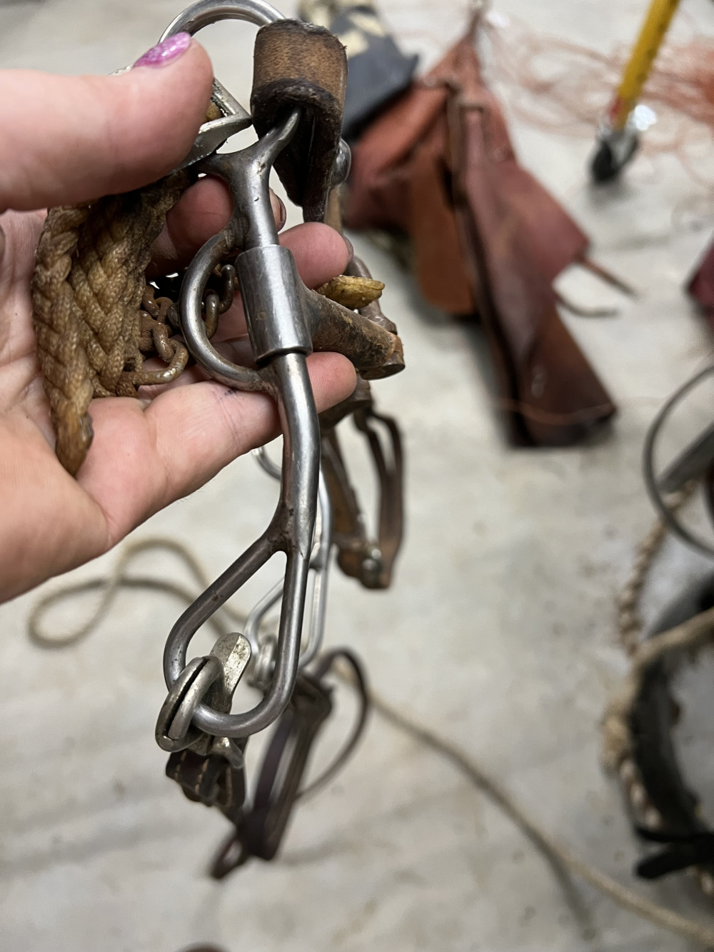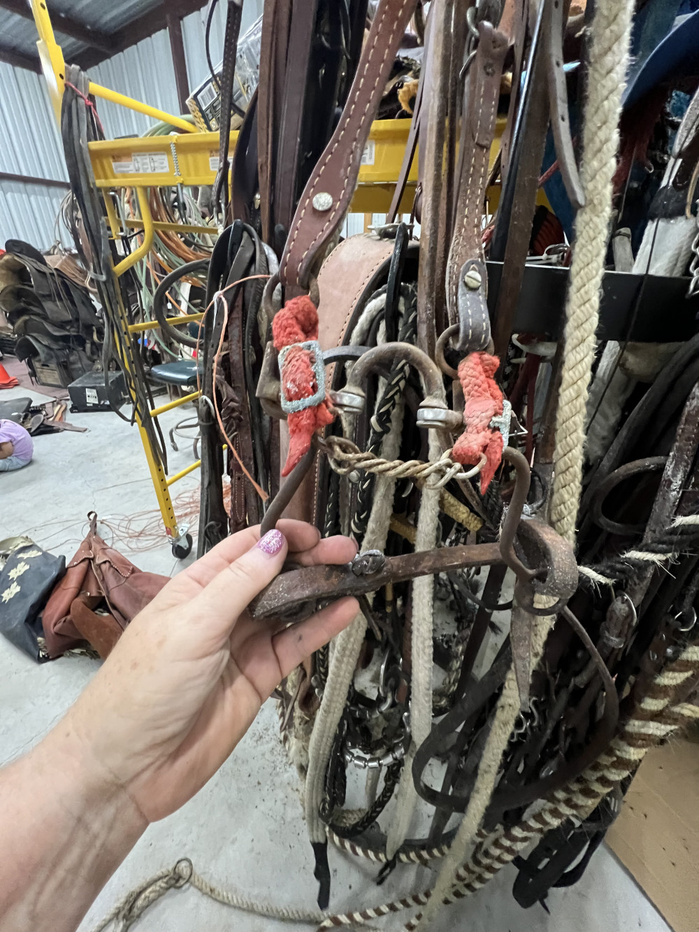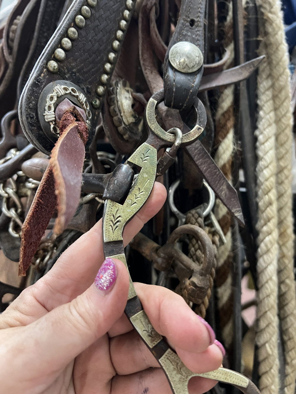 4 COMPLETE HEADSTALLS, 2 BRIDLES, AND CHOKE ROPE (#402) ESTATE SALE