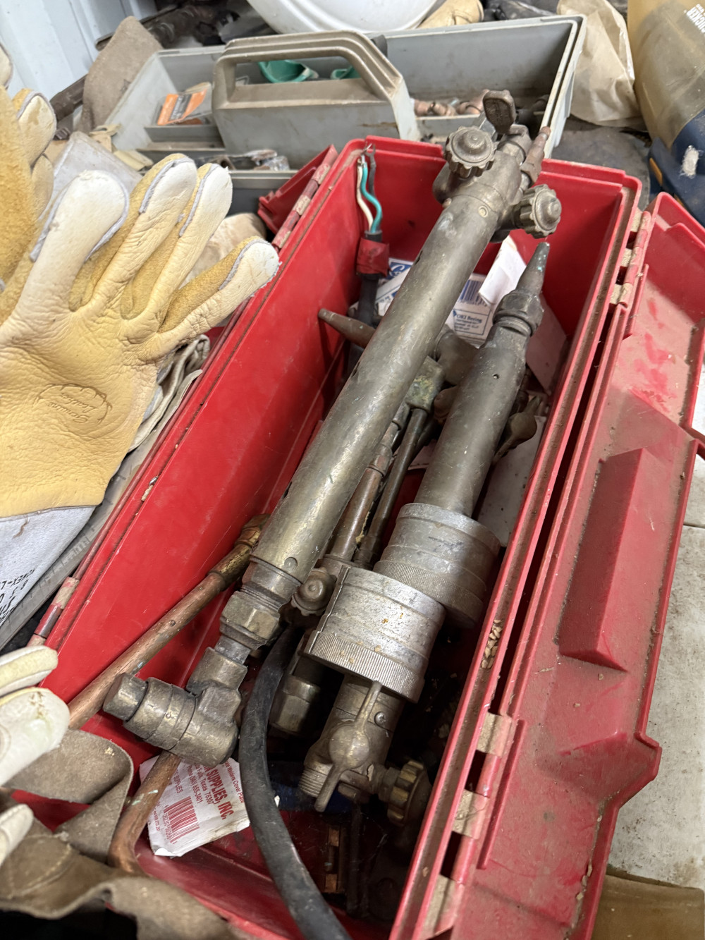 MISC TABLE GLOVES, HARDHAT, TORCH, AND PANS (#455) ESTATE SALE