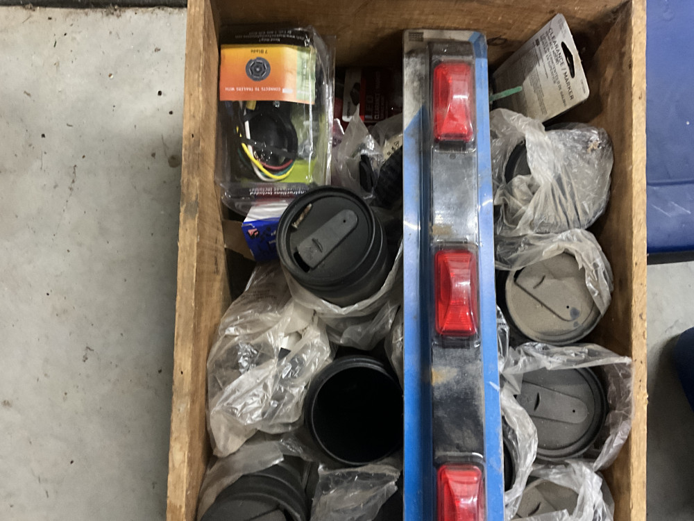 VINTAGE CRATE WITH TUMLERS AND TRAILER LIGHTS (#495) ESTATE SALE