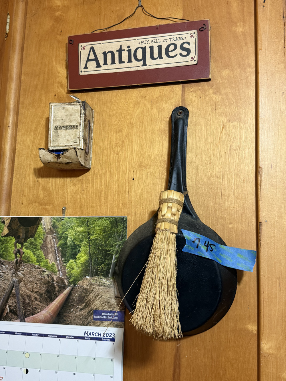 SKILLET AND VINATGE MATCH BOX HOLDER AND SIGN (#745) ESTATE SALE