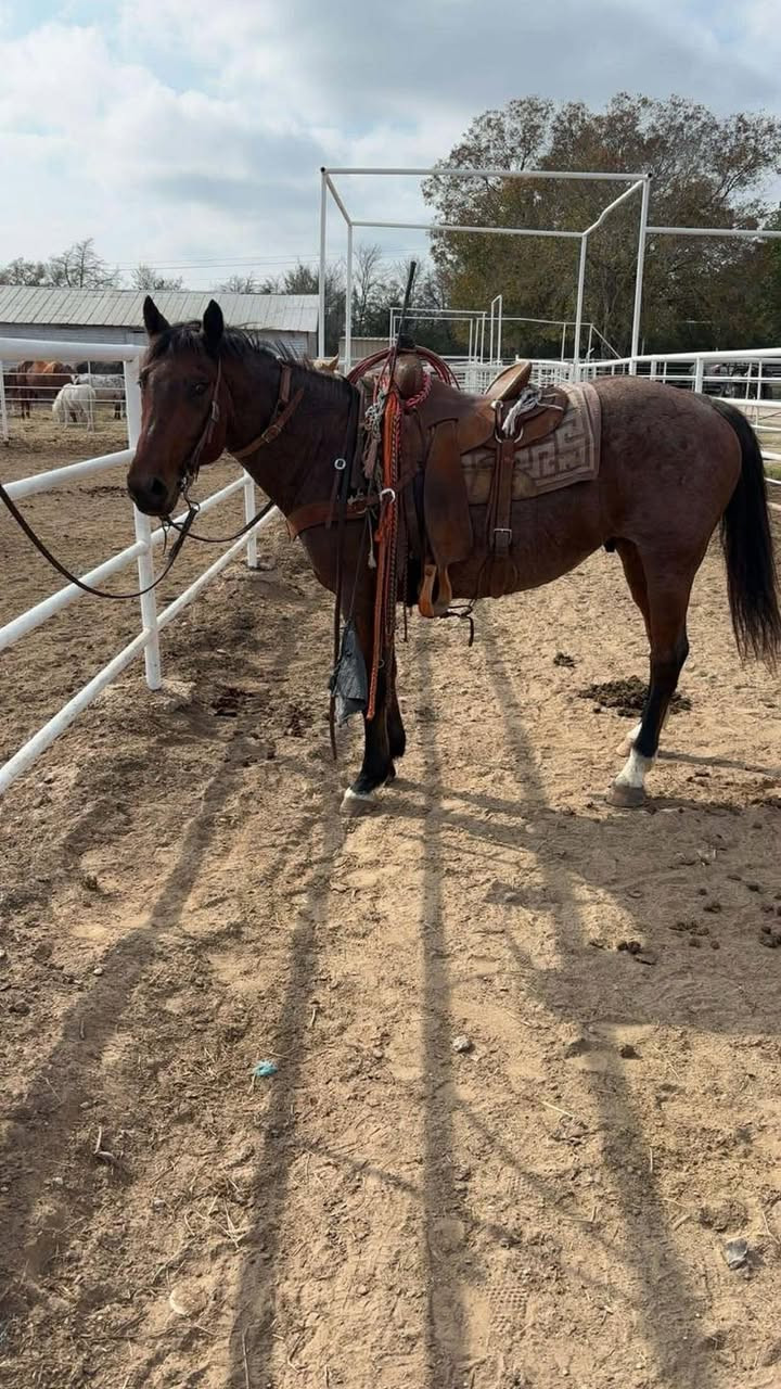 Nacho is reliable and knows a days work! He has done all aspects of ranch work. We’ve used him to rope, sort, doctor, load trucks, etc. He is desensitized to a flag, been around cattle, worked with dogs. Nacho is gentle and will get any job you need done but he is a cowboy’s horse. He stands tied quietly, loads/unloads, stands to be bathed and is easy for anybody to handle.