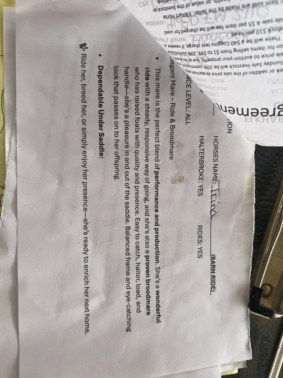 Elkhart Horse Auctions is not responsible for injuries or damages to person or property. Seller (named on front of this page) agrees to promptly pay all money owed and RELEASED from any such liability and to forebear any and above all claims against Elkhart Horse Auctions in exchange for the use of the auction barn for the purpose of buying and selling.