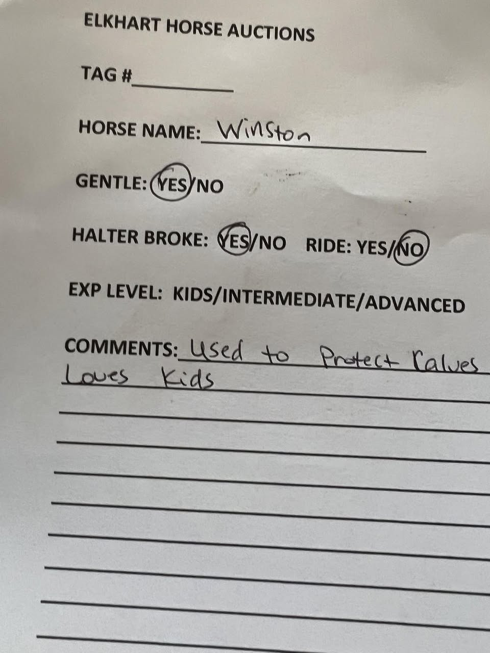 Elkhart Horse Auctions is not responsible for injuries or damages to person or property. Seller (named on front of this page) agrees to promptly pay all money owed and RELEASED from any such liability and to forebear any and above all claims against Elkhart Horse Auctions in exchange for the use of the auction barn for the purpose of buying and selling.