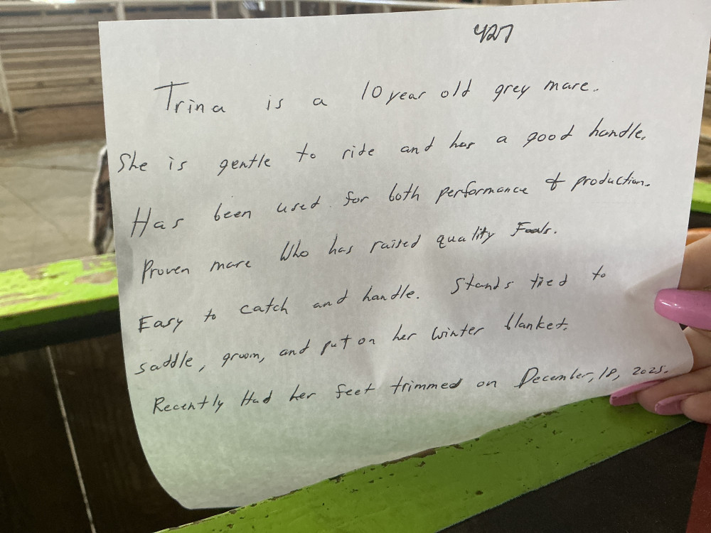 Tag 427. Trina is a 10 year-old gray mare. She is gentle to ride and has a good handle. Has been used for both performance and production. Proven mare who has raised quality falls. Easy to catch and handle. Stands tied to saddle groom and put on her winter blanket. Recently had her feet trimmed on December 18, 2025.