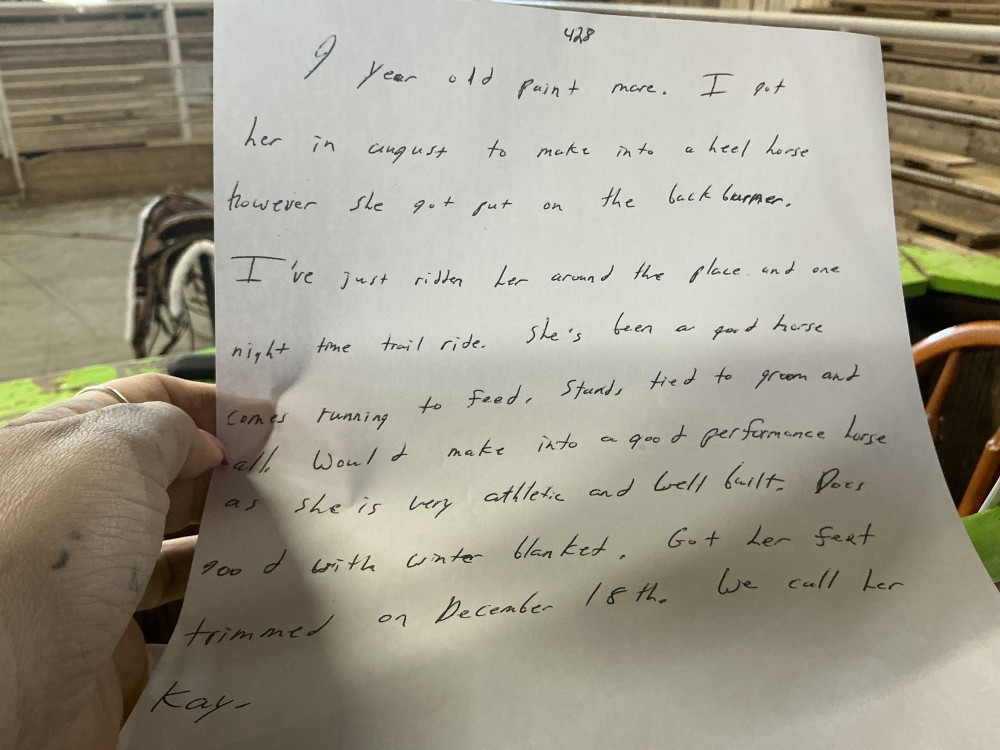 Nine-year-old paint mare. I got her in August to make into a heel horse. However, she got put on the back burner. I’ve just ridden her around the place and one nighttime trail ride. She’s been a good horse. Comes running to feed stands, try to groom and all. Would make into a good performance horse as she is very athletic and well built. Does good with winter blanket. Got her feet trimmed on December 18, 2025. We call her Kay.