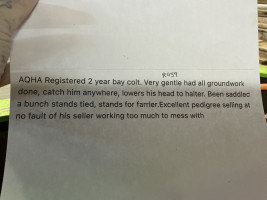 AQHA registered two-year-old bay colt. Very general had all groundwork done catching anywhere lowers his head to halter. Been settled a bunch stances tied stands for Ferrier. Excellent pedigree, selling at no fault of his seller working too much to mess with him.