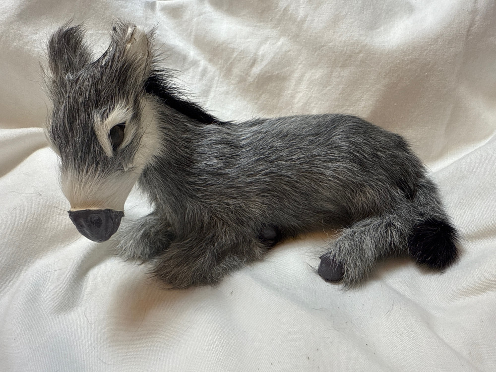 Beautiful miniature donkey figurine crafted with real fur, giving it a highly realistic and lifelike appearance. This charming piece features detailed facial expression, natural coloring, and a soft textured coat that makes it stand out from modern decorative figures
