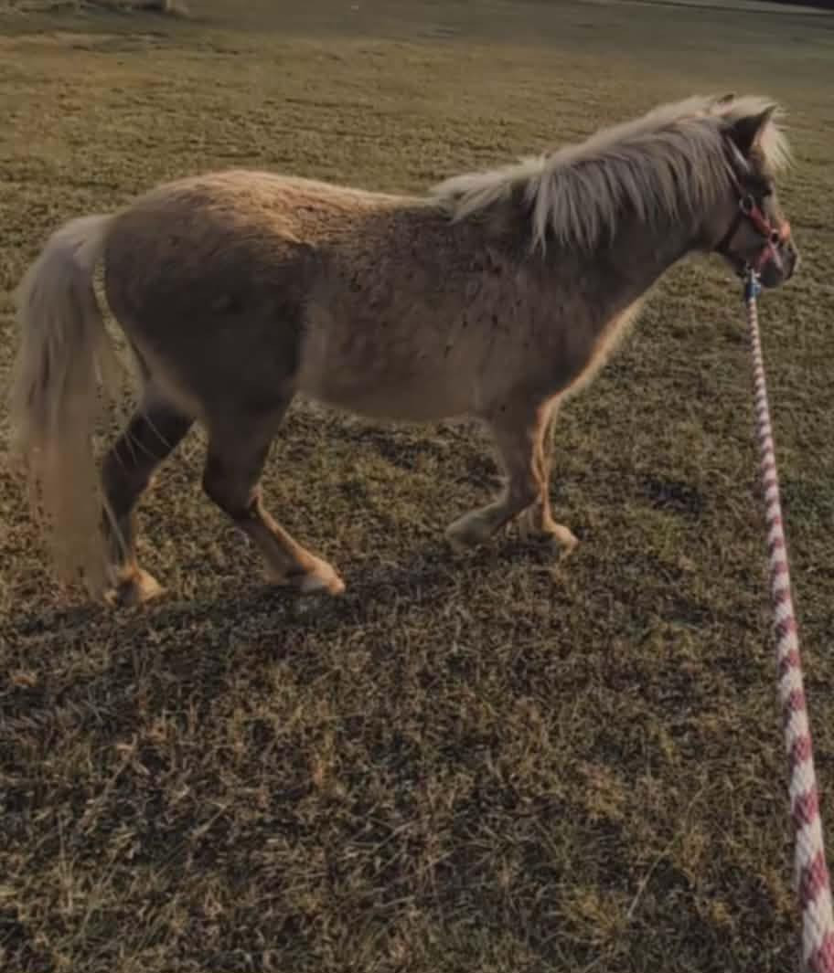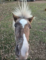 “Robert” is a 1 ½ year old chocolaty palomino stud pony. He is plump and measures about 39” tall. Robert is very in your pocket. He will meet you at the gate and follow you everywhere. He is halter broke, picks up his feet, and will lunge. Robert has had kids working with him. He is very desensitized and doesn’t seem to be scared of much.
