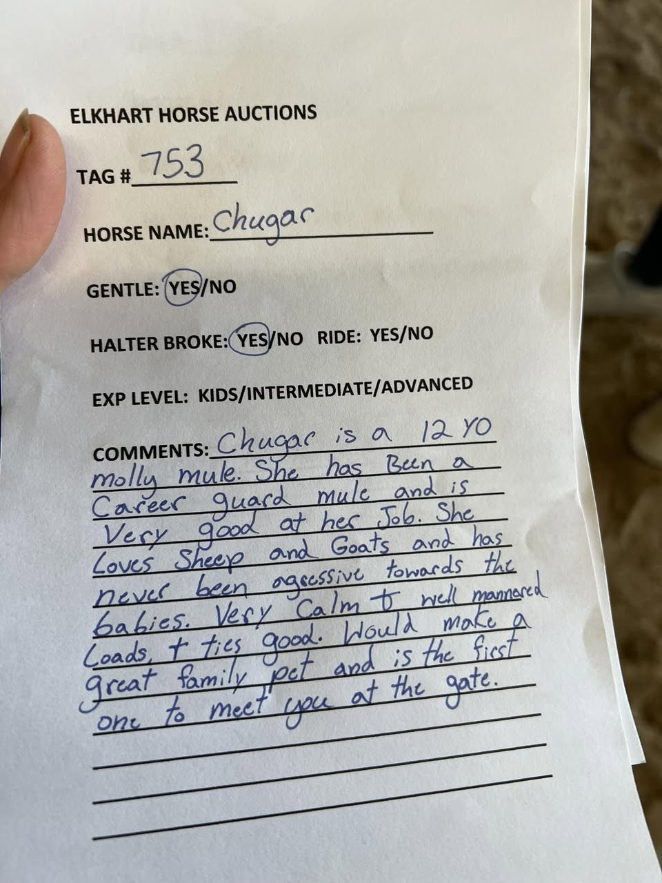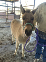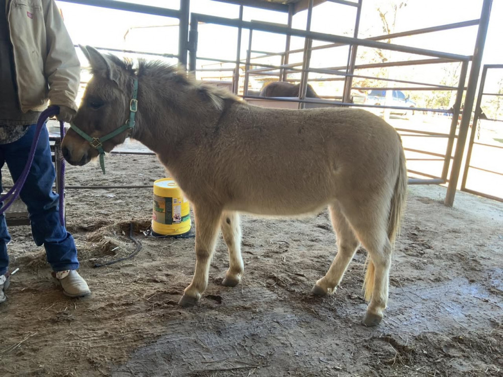 SHE HAS BEENA CAREER GUARD MULE. AND IS VERY GOOD AT HER JOB. SHE LOVES SHEEP AND GOATS AND HAS NEVER BEEN AGGRESSIVE TOWARDS THE BABIES. VERY CALM AND WELL MANNERED. LOADS GREAT AND TIES GOOD. WOULD MAKE A GREAT FAMILY PET. AND IS THE FIRST ONE TO MEET YOU AT THE GATE.