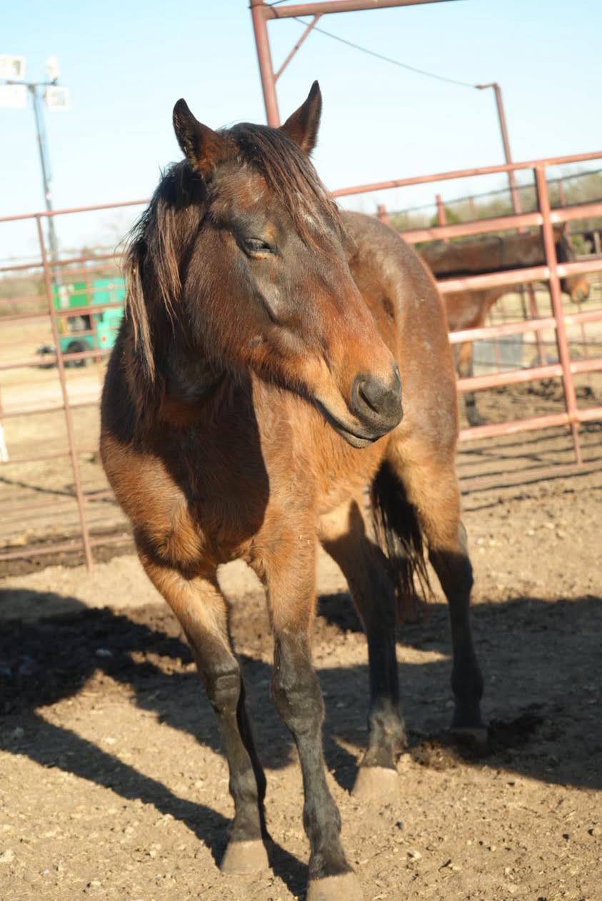King is a 3 coming 4 yr old bay roan gelding. He is a blank page. He does have a spot in eye but I think he can still some things. He is big and stout