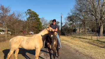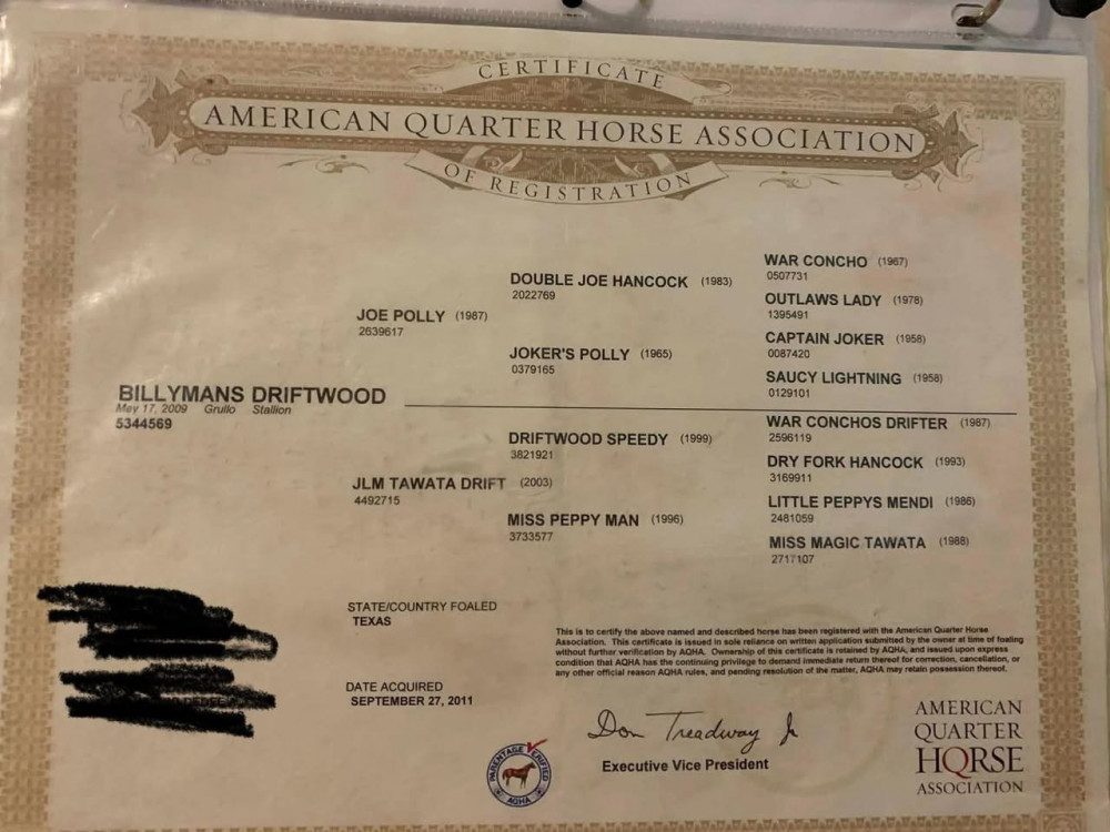 Billymans Driftwood is a 2009 model grullla stallion. He is double registered AQHA and ABRA. He’s been DNA tested and everything is in order. “Hancock” is a super nice stallion. I have owned him since he was a 2 year old. He is one of my personal horses. Handy has one of the best minds of any stallion there is. He’s very quiet and easy for anyone to handle. Hancock is broke broke broke. Standing at 14.1 he has done everything in his life. Handy is built like a tank. He runs barrels, he runs poles, he trail rides and will go through absolutely anything, he drags from the horn, leads, loads, ties, stands for the farrier, and hauls next to mares. He is super gentle, super quiet and your 90 year old grandma can even ride him. Hancock is one hand broke, sidepasses, and picks up correct leads loping. Anyone can handle him. He’s super respectful, and super quiet. Even being a teenager he is conformationally correct and still has a lot of shape. He passes that on to his babies. I trained him to lay down. He’s very smart and very willing. He has no buck, bite, kick or rear. You can pony off of him and you can catch him where you find him. He carries my brand. This horse has not been passed around whatsoever. He has been hauled, he has been exposed, he is not spooky, he is not jumpy. Hancock is probably one of the most versatile horses I’ve been around. He does it all. And he contributes that to his babies. Several of his foals have went on to be money earners in the roping pen and in the barrel pen. He is fast and he will throw speed to his colts. This horse is tough and he will work all day for you. He is all heart and does not quit. He is also listed through APHA so you’re able to get your paint colts registered as well. He is EE meaning you will never get a red based colt out of him. I have both sets of papers and a signed transfer in hand. Breeding season is just around the corner and if you’re looking for a gentle quiet minded stallion to add brains, color, and shape to your herd this is the boy for you. The dun and white in the pictures is a 5 year old daughter out of him currently winning money in the barrel pen.