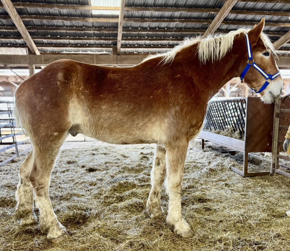 Bruce is a 3 yr old Belgian gelding. He is broke to drive. He a sweet and easy giant. He's over 18 hands tall and still has 3 more years to grow! He has lots of personality