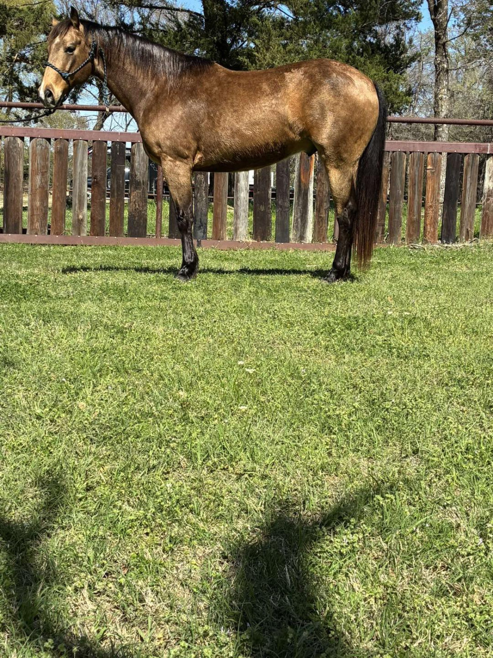 Bugs is a5yr old gelding. We have been day working on him for the past week. Bugs had late start but is really smart. Bugs picks all his feet up, loads unloads, lopes circles both directions. With a little time with bugs he would make a really nice head or heel horse.