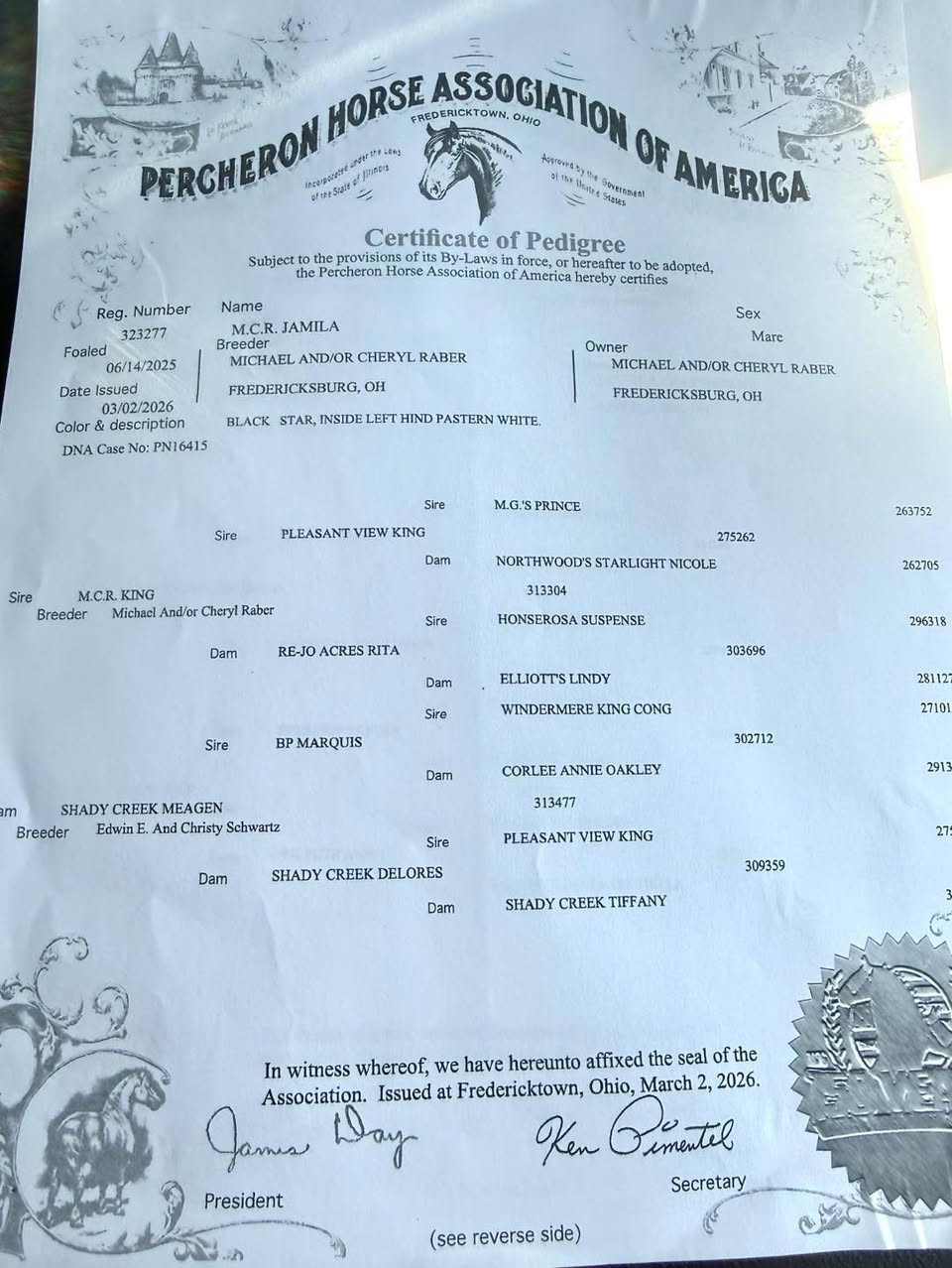 Meet M.C.R. Jamila — a stunning black registered Percheron filly with a star and a white pastern, foaled June 14, 2025. She's halter broke, great with people, and already showing the presence and quality you'd expect from bloodlines like hers. Pleasant View King — a six-time Premier Sire and 1998 World Champion — appears on BOTH sides of her pedigree. Her great-grandsire M.G.'s Prince sired two World Champion stallions, Windermere King Cong, a two-time All American and Premier Sire, runs through her dam's side, AND her grandsire BP Marquis was a 2008 National Champion. This filly is stacked from top to bottom with proven, winning bloodlines. Whether you're pointing her toward the show ring, the hitch, or just building something special for the future, Jamila has the breeding to back it up every step of the way. She is the real deal.