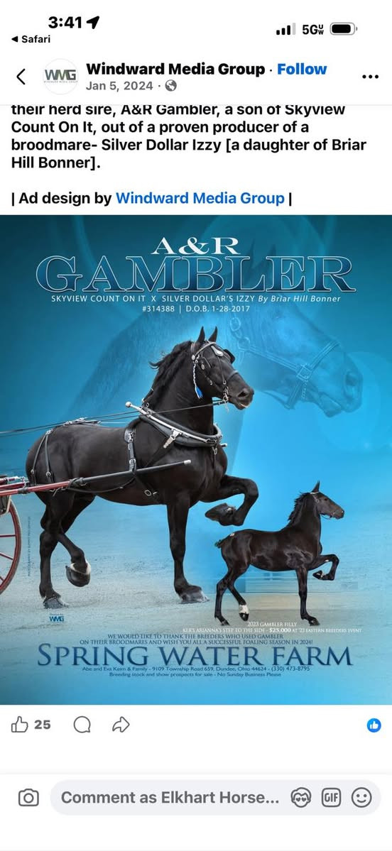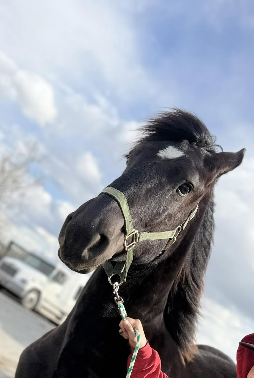 Ringing Bell's Raindrop — a registered black Percheron colt with a bold star and both hind pasterns white, foaled March 30, 2025. Halter broke, stoutly built, and genuinely a nice colt from the ground up. His grandsire A&R Gambler is a son of Skyview Count On It — a proven producer of multiple World Champions — and Gambler offspring have commanded serious prices at auction, including a filly that sold for $25,000 at the 2023 Eastern Breeders Event. His dam's side carries the legendary Pleasant View King, six-time Premier Sire and 1998 World Champion. The bloodlines are real and this colt delivers on every bit of them.