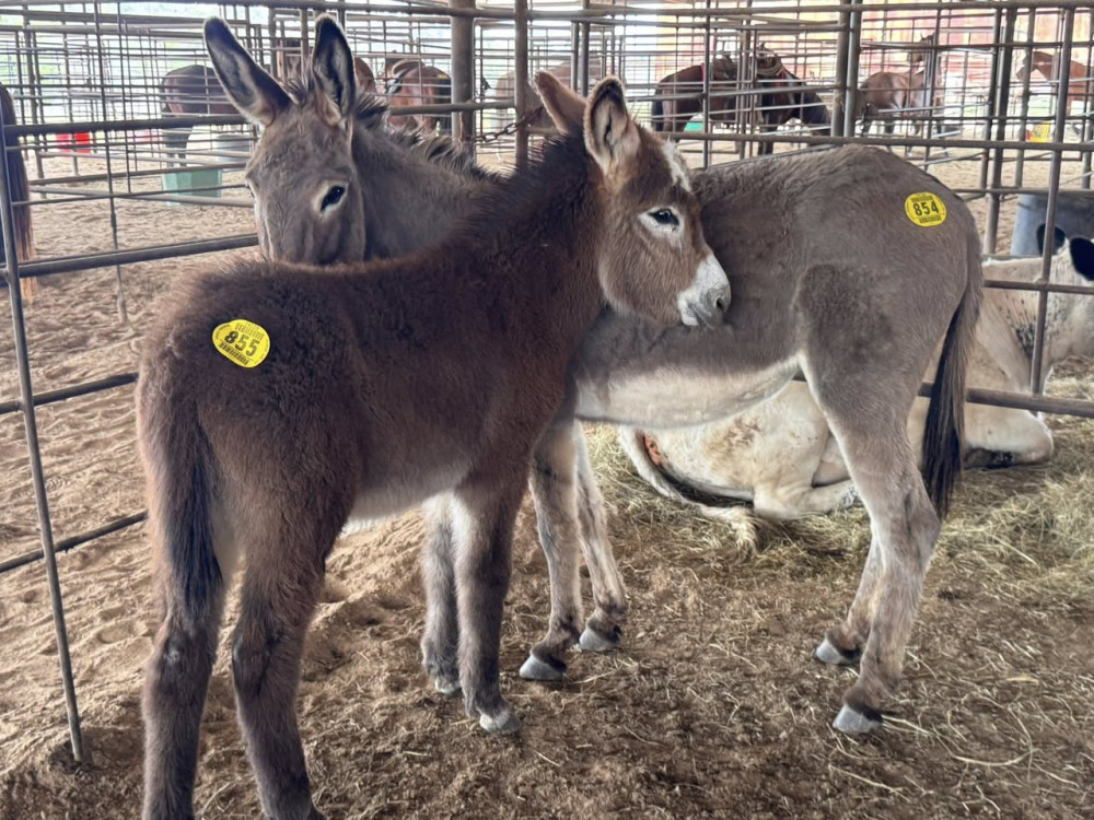 DONKEY 3 YR GREY JENNY. SELLS W/855 (#854) MARCH 28,2026 HORSE SALE SADDLES START @ 6 PM