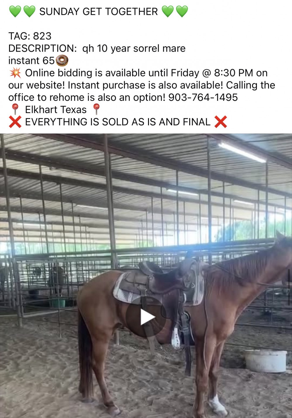QH 10 YR SORREL MARE (#823) Sunday Sale 3/28 to 4/3