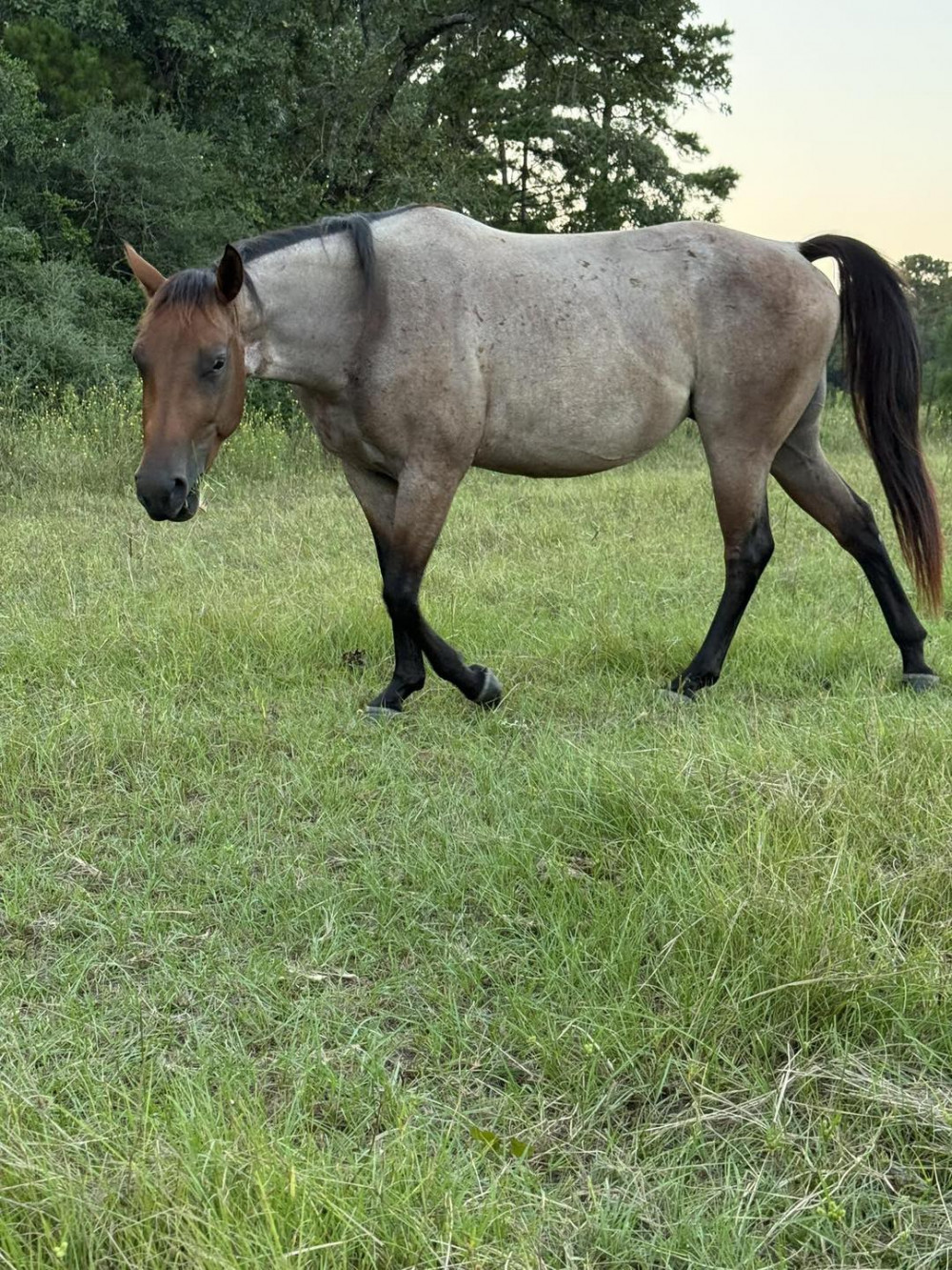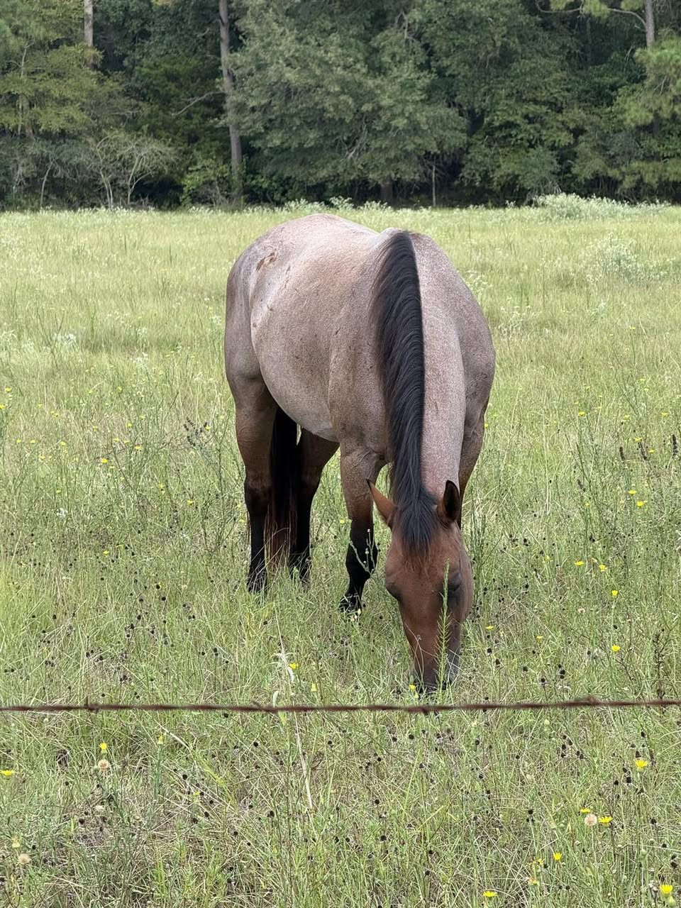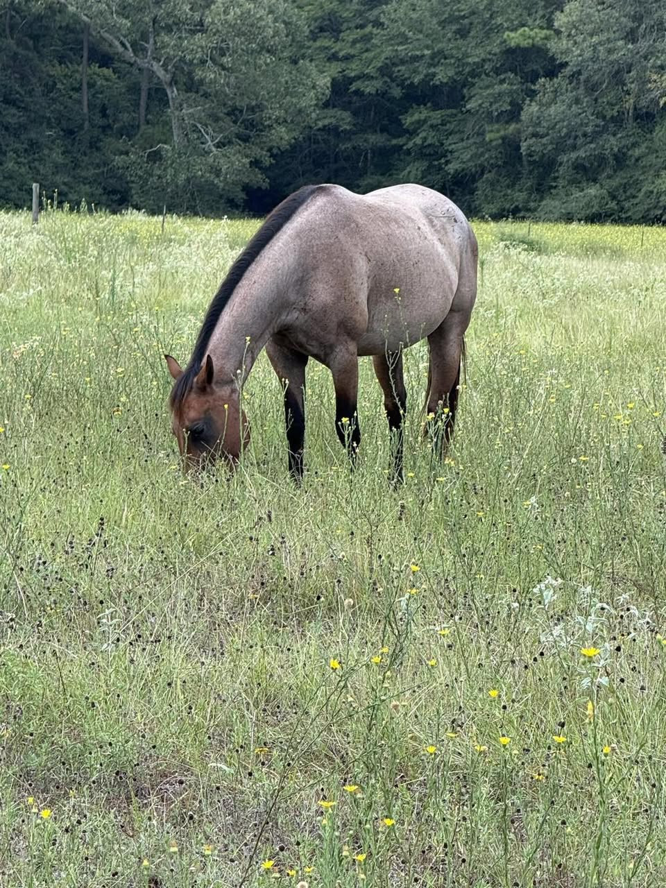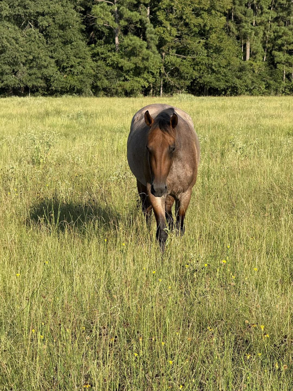 This is Misty four year-old registered quarter horse mare she was born and raised on my place super sweet and gentle. She has more row than she loves to swim with the kids she's been used on the trails and on the ranch just pleasure writing nothing fancy she's been turned out about eight months saddle her up and took off writing hasn't missed a step take her in tune her up and she will make you a really nice family. Horse selling no fault of her own. I decided it was time to let some go even though it breaks my heart.
