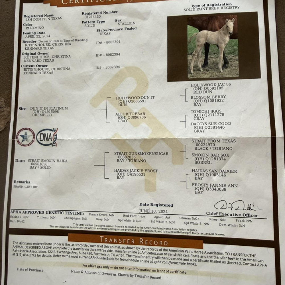 Charlie is a stud colt. Stud coat by done it in platinum, which is a raining stallion and Own son of Hollywood dun it and out of strait smokin Haida.