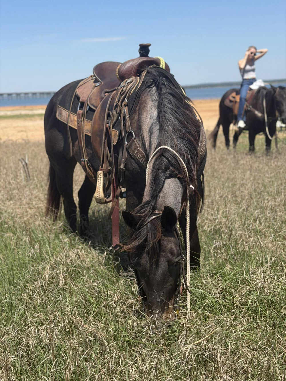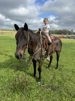 Here is a really nice ranch/trail blue roan mare that’s done a little bit of it all. Moana will go anywhere you point her. Has been around cattle/wagons/water/dogs you name it. She is not a slow dead head. Will keep up with the mules pulling wagons. For that I wont call her a kids horse. Needs an intermediate rider or experienced mature kid that wants one with some go. Awesome neck rein and ground manners. No buck kick bite/bad habits. Will back out of the trailer or turn around and walk out. Not buddy sour. Don’t have anything bad to say about her, just need the money more than the horse.