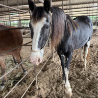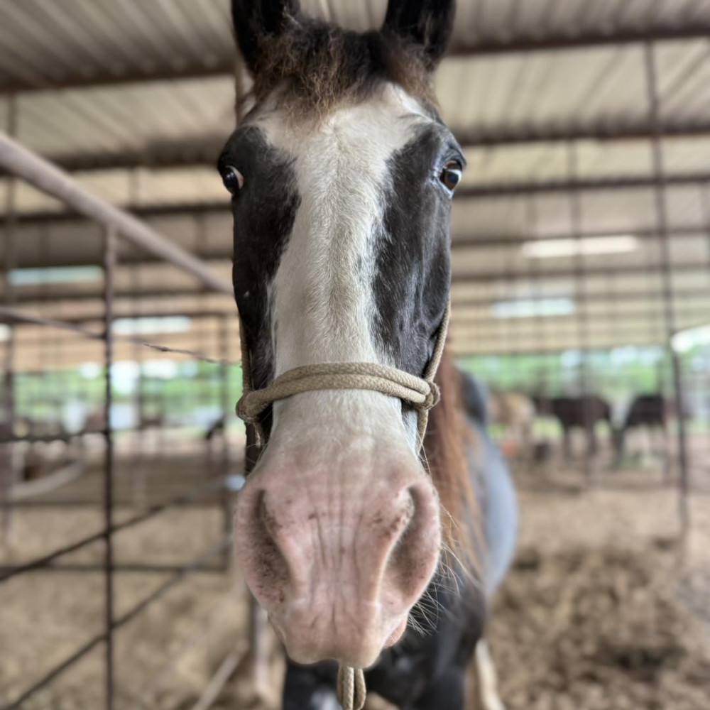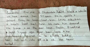 COMANCHE 18 YRS OLD 1/2 CLYDESDALE 1/2 QH BLACK AND WHITE - WE HAVE OWNED HIM 5+ YEARS. HE IS A GENTLE & PATIENT. EASY TO CATCH, LOAD, TRIM. LOVES ATTENTION & ATTENTION & TREATS. GOOD TRAIL HORSE. WE RODE HIM AROUND THE HOUSE & AT THE DEER LEASE. TEETH FLOATED & AGED 3 YRS AGO. NEVER BEEN LAME & NO MAINTENANCE REQUIRED. CAN BE A LITTLE BUDDY SOUR BUT WILL RIDE OFF & BE OKAY. HAS NEVER BUCKED