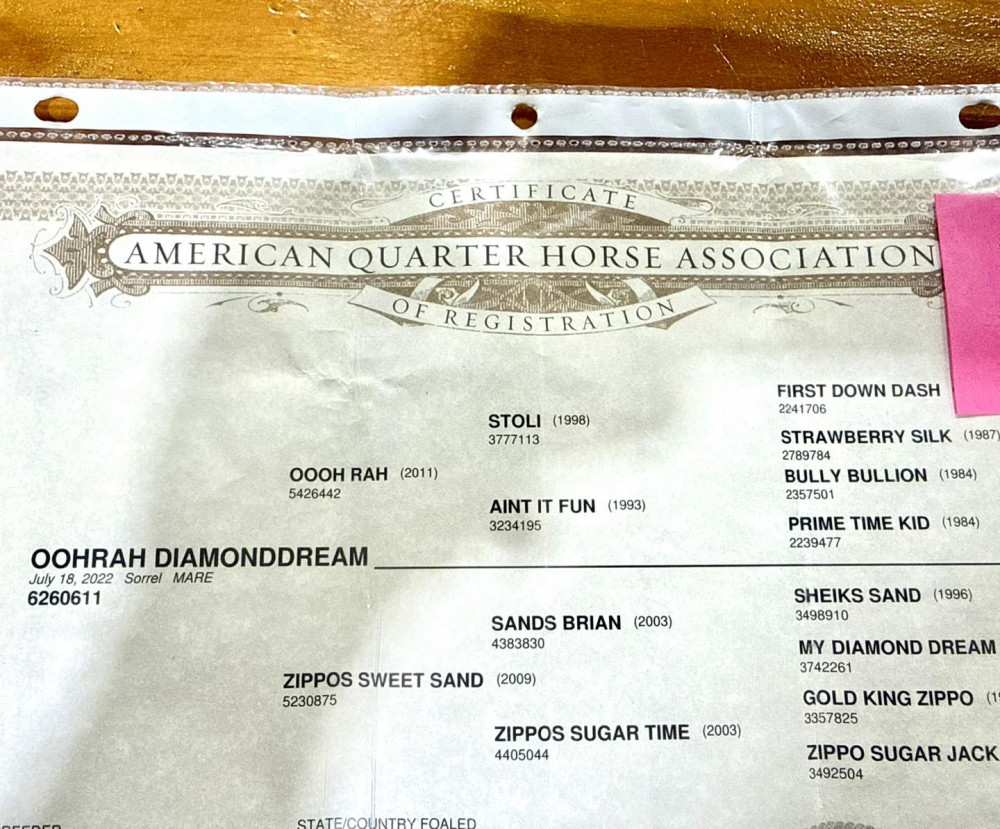 Oohrah Diamonddream – 2022 Sorrel Mare is packed with proven race bloodlines on top, being by a son of Stoli (SI 99), earner of $332,237, with offspring earnings exceeding $17 million and multiple stakes winners. She also goes back to the legendary First Down Dash and Strawberry Silk. On the bottom side, she is out of a Zippo-bred mare (Zippos Sweet Sand), going back to Zippos Sugar Time and Zippo Sugar Jack, known for their good minds and rideability. She is started under saddle, green broke, and will need more riding—best suited for an experienced rider to finish her out. This mare offers a great combination of speed and a good-minded foundation, making her a strong prospect for performance, riding, or future breeding.