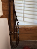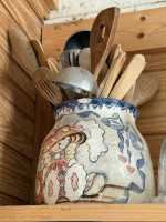# 348 — COOKIE JAR WITH SPOONS, HORSE COOKIE JAR AND METAL BUCK ON SHELF N HORN RACK AND "OCCIDENTALY ROWDY" SIGN